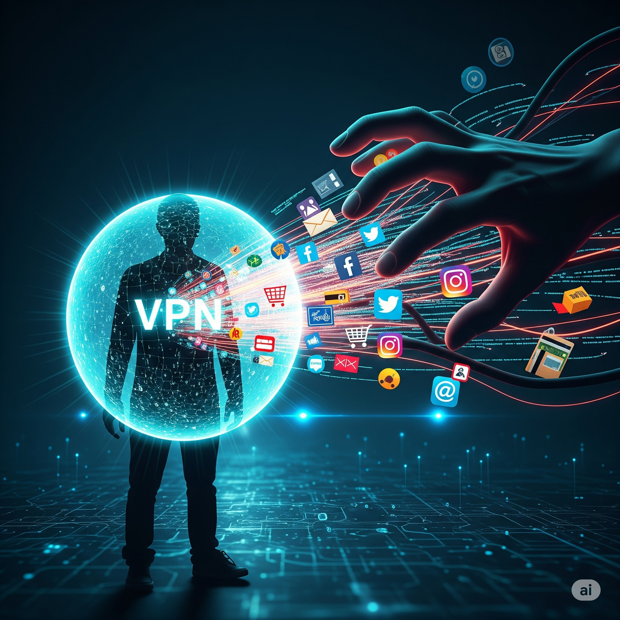 Image Suggestion: A digital illustration of a person’s silhouette with lines of data and icons (shopping carts, social media logos) flowing out of them, being intercepted by a large, shadowy hand. The VPN is represented as a glowing, protective sphere around the person.